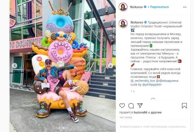 net. Филипп Киркоров пополнил свою Instagram страницу кадрами прогулки по огромному парку развлечений, где сфотографировался на фоне самых ярких местных достопримечательностей. На первом фото Филипп Бедросович позирует около знаменитого персонажа Оптимуса Прайма из фильма о трансформерах. Певец даже на отдыхе не отходит от своего звездного образа и надел для прогулки удобные, но яркие шорты с "космическим" принтом и броские кроссовки розового цвета. Свой наряд певец дополнил сочной розовой футболкой с надписью, "разукрашенной" курткой с металлическими шипами и черной бейсболкой. На второй фотографии Филипп Киркоров, стоя под огромным глобусом с надписью "Universal", широко расставил руки и ноги, словно заключая огромный мир в свои объятия. На третьем снимке улыбающийся Киркоров предстал в компании PR-менеджера и танцора Кости Вечерского, а также популярным диджеем и яркой брюнеткой Екатериной Гусевой. Филипп обнял своих друзей, позируя на фоне знаменитого паровоза из фильмов о Гарри Поттере. Также певец показал снимки на фоне реквизита из фильма "Парк юрского периода" и даже успел посидеть на шикарном "сладком" троне из пластмассовых пончиков, где Филипп Киркоров вальяжно уселся, словно на домашнем диванчике. "Традиционно! Universal studio! Orlando! Полёт нормальный! Но перед возвращением в Москву, конечно, приехал получить заряд эмоций перед новыми проектами и премьерами! Заряжайтесь нашим настроением, как от электричества! Минусы - в прошлом. Плюсы - в будущем. А сейчас - радостное напряжение! Главное, окружайте себя классной компанией. Со мной рядом всегда позитивные люди",- подписал свою публикацию певец. Посмотреть эту публикацию в Instagram Публикация от Филипп Киркоров (@fkirkorov) Поклонники в своих комментариях неоднозначно отреагировали на туристическую фотосессию Филиппа Киркорова. "Не знает чем себя занять", " Кайфуйте! Имеете право", " Филипп, откуда у вас столько энергии?!", "Круто!!!", " Любовь с первого взгляда", "Вам идёт седина", " Настя Стоцкая в сто раз лучше!", " Какие классные и сколько ярких цветов", "Дед. На батю похож своего", "Эти седые кудряши больше подходят Ю.Куклачеву. Это точно не Ваш образ",- написали фолловеры в соцсети. Напомним, покинувший Россию Киркоров закатил грандиозную вечеринку в своем особняке за границей: "Все эти рожы надоели" Как сообщала Politeka, поседевший Киркоров в драных штанах удивил видом без парика в обычной жизни, Бузова не смолчала: "Поехали..." Также Politeka писала, что Киркоров поразил странными детскими забавами: "Никак Филиппик не вырастет"