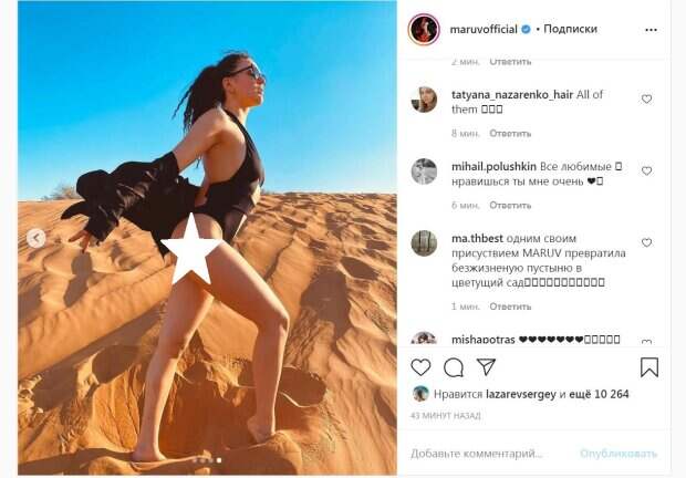 Популярная украинская певица MARUV устроила красивую фотосессию в пустыне Известная артистка MARUV (Анна Корсун - настоящее имя) сейчас отдыхает в теплых краях и делится свежими фото, сообщает Politeka.net. В этот раз красотка устроила красивую фотосессию в купальнике посреди пустыни. Снимки украинская знаменитость разместила в своем Инстаграм.