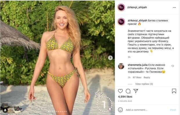 В сети проходит так называемая "Битва стальных прессов", где сравнивают фигуры знаменитостей Как сообщает Politeka.net, в Инстаграм-профиле "Зірковий шлях" сравнивают фигуру самых желанных украинских знаменитостей. "Битва стальных прессов" - так назвали сборку фотографий девушек в купальниках. В подборку фотографий попали: певица Оля Полякова в мини-бикини желтого цвета с цветочным принтом, Алина Гросу с черном купальнике с завязками, Надя Дорофеева в спортивном купальном топе и плавках на завязках, Юлия Санина в белой растегнутой рубашке и джинсах, певица Руслана в черном топе на завязках и джинсовых шортиках, Гайтана в черном бюстье и спортивных шортах, Ольга Горбачева в оранжевом купальнике, Виктория Смеюха в купальнике расцветки зебры, Марина Узелкова в цветном бикини и Солоха, которая отличилась зимней фотографией.