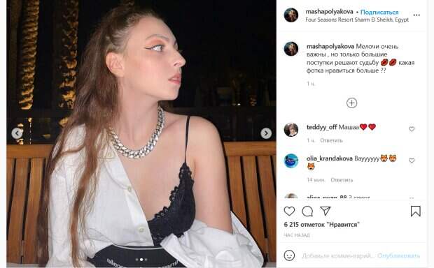 На снимках девушка сидит во дворе отеля, в котором они остановились с мамой. Дочь певицы вышла на свежий воздух поздно вечером. Внимание к себе сразу привлекает дерзкий образ Маши. Она расстегнула свою белую рубашку и спустила ее с одного плеча, оголив половину груди и засветив кружевное черное белье. В таком виде девушка сидит на лавочке на фоне пальм. Отдельное внимание привлекает к себе макияж школьницы с персиковыми тенями и крупными стрелками, которые также любит ее мама. «Мелочи очень важны, но только большие поступки решают судьбу», - подписала снимки Маша и поинтересовалась у поклонников, какой им нравится больше. Подписчики девушки бурно отреагировали на ее вызывающий пост. «Куда смотрит Мама?», «а мама снимает все нормально, за своими следите», «Маш, ну... Ну никакая», «Офигенна просто красотка огонь», «Стрелки супер на всех фотках», «Что ты делаешь со мной ангел мой», «Неудачный ракурс», «Особо никакая...у тебя есть намного лучше фотографии», - пишут люди. Напомним, полуголая дочь Поляковой, оседлав поручни на пирсе, показала свои "кровь с молоком": "Завидуйте молча!". Как сообщала Politeka, юная дочь Поляковой ушла в отрыв на роскошном курорте, удивив даже маму: "Ты что, бухаешь? ". Также Politeka писала, что 16-летняя дочь Поляковой устроила недетскую фотосессию в бикини, затмив даже маму: "Горячая штучка".