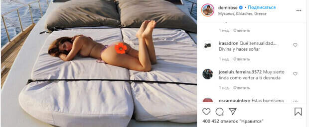 Обладая шестым размером бюста, девушка всегда подчеркивает его красоту. При этом, как можно заметить на фото, не только им гордится Деми. Но еще и пышными ягодицами. Девушка нередко делает селфи в зеркале, показывая лишь их. В этот раз в тоненьком светлом купальнике она снова сделала акцент на достоинствах, улегшись на мягкой кровати. Яркий кадр на природе не оставил равнодушными поклонников: «Жизнь прекрасна, и есть чему улыбаться