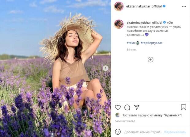 Эта тенденция стала очень актуальной в Украине. Екатерина Кухар решила быть в тренде и устроила фотосессию посреди цветов. В кадре она позирует на фоне лавандовых полей. На балерине одета одежда из легких тканей бежевая юбка и кофейный топ, а голову украшает простая соломенная шляпа. К слову, фотографиями всё не обошлось. Екатерина Кухар также опубликовала видео всё с той же локации. «Он поднял глаза и увидел утро — утро, подобное ангелу в золотых доспехах…»