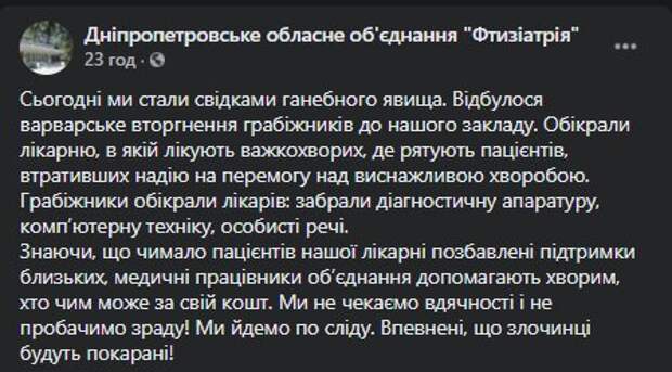 В Днепре обворовали противотуберкулезный диспансер Как передает Politeka.net, об этом сообщили на Facebook-страничке Днепропетровского областного объединение "Фтизиатрия". "Обокрали больницу, в которой лечат тяжелобольных, где спасают пациентов, потерявших надежду на победу над изнурительной болезнью.