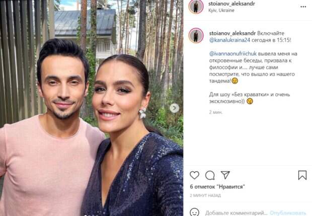 Он активно дает интервью, о чем сообщил на своей странице в Instagram и опубликовал кадры со жгучей красоткой. Как оказалось Стоянов дал откровенное интервью для ведущей шоу "Без краватки", актрисе и модели Иванне Онуфрийчук. "Она вывела меня на откровенные беседы, призвала к философии и…. лучше сами посмотрите, что вышло из нашего тандемa", - отметил Александр в подписи к снимкам. На снимках Стоянов оказался на кухне современного дома, где насладился беседой и чашечкой чая. Кроме того, он показал кадр, где приобнимает девушку за талию. Для интервью он выбрал горчичные штаны, футболку лососевого оттенка и белые кроссовки. Иванна Онуфрийчук пришла в облегающем сияющем платье, расшитом пайетками. В дополнение к образу она сделала выразительный мейк-ап со smoky eyes и бледно-розовыми губами. Поклонники не смогли сдержать слов восторга и оставили комментарии под фото. Некоторые поинтерисовались, "а где же Катя" и поинтерисовались не ревнует ли она мужа к таким красавицам. Напомним, муж Кухар из "Танців з зірками" без рубашки поделился секретом на все случаи жизни. Как сообщала Politeka, грустная Кухар из "Танців з зірками" объявила о завершении важного этапа в своей жизни. Также Politeka писала, что Кухар из «Танців з зірками» в невесомой одежде предалась наслаждению в поле.