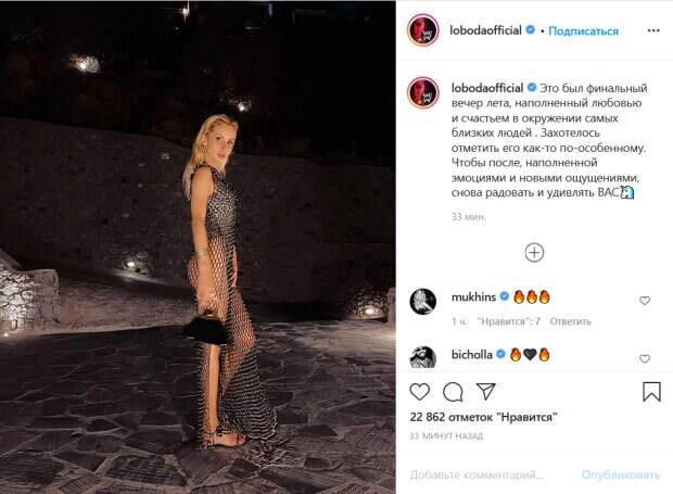 На ней черное платье до самого пола в крупную просвечивающуюся сеточку. Под ним угадывается боди или купальник. Волосы певица слегка зачесала назад, а свой образ дополнила золотыми украшениями и легким макияжем. «Это был финальный вечер лета, наполненный любовью и счастьем в окружении самых близких людей. Захотелось отметить его как-то по-особенному. Чтобы после, наполненой эмоциями и новыми ощущениями, снова радовать и удивлять ВАС», - подписала кадр звезда. Ее поклонники тут же принялись комментировать фото. «Лободуся вы всегда радуете меня и своих верных поклонников», «Вы...Светлана...перевернули себя на 360 градусов...Я не помню таких преображений на нашей эстраде...так держать», «Женская красота неописуема!», «Прямо русалочка! Счастливая и красивая!!», «тропикана-женщина», «Шикарная!», «Емае какая чика», - пишут преданные фанаты знаменитости. Отметилась в комментариях и певица Лолита Милявская. «Самая красивая», - восторженно написала она под фото Лободы. Напомним, соблазнительная сестра Лободы показала себя на пляже рядом с красавчиком: "За него стоит бороться". Как сообщала Politeka, расслабленная Лобода похвасталась идеальными формами в томной позе: «Какие изгибы». Также Politeka писала, что похудевшая Лобода без лишней скромности показала прелести в «невидимом» бикини: «Я активно занималась…».