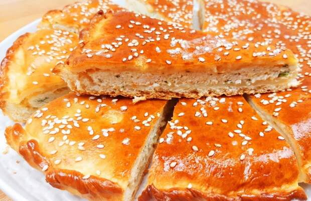 Перемешать и влить кефир. Ложкой замесить тесто (опару). Затем накрыть пищевой пленкой, и оставить на 30-40 минут. Тем временем можно подготовить начинку. Например, фарш, картофель, капусту, грибы, творог.Автор рецепта рекомендует приготовить пирог с куриным фаршем. Подробный рецепт здесь. В опару влить воду и масло. Перемешать и добавить муку. Должно получиться мягкое тесто, и слегка липнуть к рукам. Затем тесто опять накрыть пленкой, оставить на 20 минут. Готовое тесто разделить на две части (2/3 и 1/3). Большую часть раскатать в круг диаметром примерно 22 см. Тесто переложить на противень, застеленный пергаментом. Равномерно распределить начинку. Также раскатать вторую часть теста. Затем накрыть начинку, и защипнуть края. Руками немного растянуть пирог, чтобы он стал тоньше. В середине сделать небольшое отверстие и надрезы по всему пирогу. Для того чтобы выходил пар, и не поднимался верхний слой теста. Пирог накрыть пищевой пленкой, оставить на 10 минут. Выпекать в разогретой духовке до 210 ℃ 20-25 минут. Перед выпечкой пирог смазать взбитым яйцом, присыпать кунжутом.Готовый горячий пирог смазать сливочным маслом.