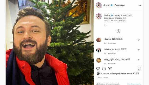 Популярный украинский певец DZIDZIO поделился своей радостью Артист регулярно делится со своими поклонниками разными снимками из жизни, передает Politeka.net. В этот раз певец поделился своей радостью. Певец активно готовится к новогодним празником и уже даже рассказал, что ему привезли елочку. Радостный DZIDZIO сфотографировался возле зеленой красавицы, широко открыв рот.
