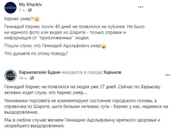 В сети появилась волна слухов о смерти Харьковского городского головы Геннадия Кернеса В Харьковском горсовете сделали заявление, передает "Справжня Варта". «Геннадий Кернес проходит лечение в берлинской клинике «Шарите». Отделение, в котором находится Харьковский городской голова, имеет четкий регламент своей работы, который не предполагает у пациента и тех, кто его посещает, никаких гаджетов.