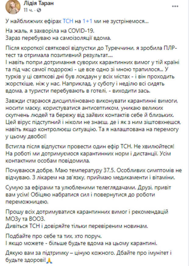 "В ближайших эфирах ТСН на "1+1" мы не встретимся... К сожалению, я заболела COVID-19. Сейчас нахожусь на самоизоляции дома. После короткого праздничного отпуска в Турции, я сделала ПЦР-тест и получила позитивний результат... И даже несмотря на соблюдение строгих карантинных требований в той стране и во время самого путешествия - это все равно со мной случилось... Этот вирус коварный и никогда не знаешь, где и как с ним столкнешься, даже если контролируешь ситуацию", - заявила Лидия. Ведущая добавила, что в настоящее время чувствует себя хорошо, температура 37,5. Кроме того, она поддерживает связь с врачом, принимает лекарства и витамины. В своем микроблоге в Инстаграм Таран даже шутит: опубликовала забавные снимки, где якобы борется с вирусом, изображенным на огромном экране. "На 1 фото я его, на 2 - он меня? О нет! Не дождется! Бороться с вирусной тварью витамином С, В, цинком и сериалами - занятие, конечно, увлекательное, но я бы предпочла обратно на работу!