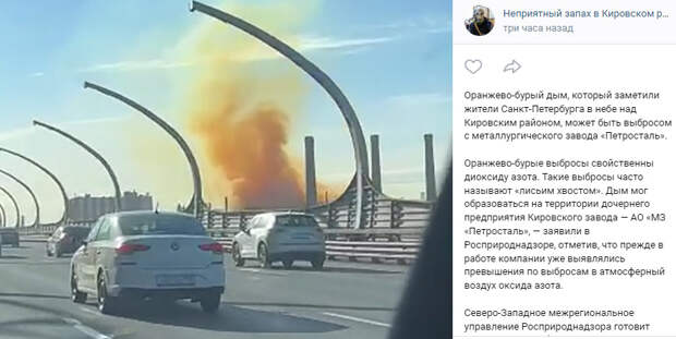 На записи зафиксирован выброс рыжего дыма с территории Кировского завода. «Оранжево-бурые выбросы свойственны диоксиду азота. Такие выбросы часто называют „Лисьим хвостом“», — сказано в сообщении. Ведомство считает, что зафиксированные в видеозаписи дым мог образоваться на территории АО «МЗ «Петросталь», являющегося дочерним предприятием Кировского завода. По данным Управления, ранее в деятельности компании выявлялись превышения по выбросам в атмосферный воздух оксида азота. Северо-Западное межрегиональное управление Росприроднадзора в настоящее время готовит материалы для объявления компании предостережения по соблюдению обязательных требований по контролю выбросов в атмосферный воздух. Указывается на недопустимость нарушения требований, предъявляемых к охране окружающей среды.