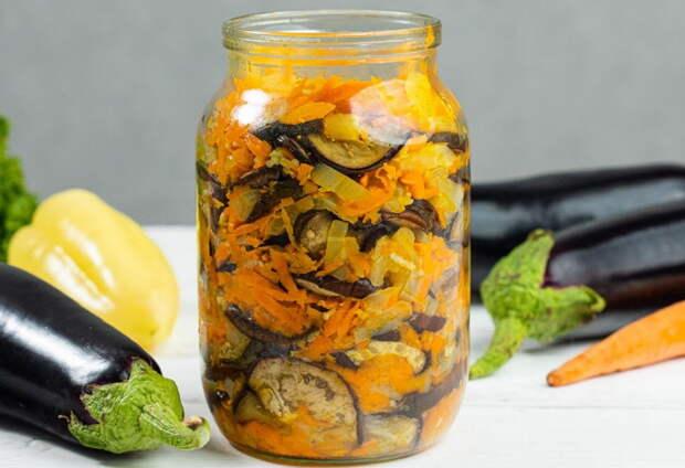 Переложить в миску и посолить. Морковь натереть на терке, перец нарезать полосками. Обжарить на сковороде до готовности. Добавить чеснок, пропустив его через пресс. Посолить и поперчить по вкусу. Когда овощи остынут, влить яблочный уксус. Слоями сложить в банку обжаренные овощи и баклажаны. Накрыть крышкой, поставить в холодильник на 8 часов, а лучше на сутки. [embed][/embed]