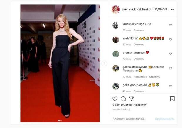 Известная актриса Светлана Ходченкова, звезда фильмов "Квартал 95", показала себя на светском мероприятии На фото Ходченкова показалась в комбинезоне с поясом на талии.. Девушка стояла на красной дорожке, взявшись рукой за бедро, а волосы оставила распущенными. Светлана дополнила образ украшением на шее, а сама смотрела в объектив камеры.