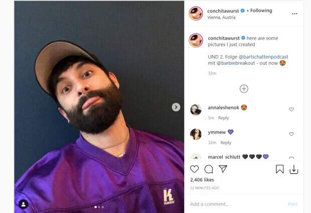 Австрийский певец и победитель "Евровидения" Томас Нойвирт, который известен под псевдонимом Кончита Вурст, удивил новым бородатым образом Как пишет Politeka.net, артист выложил на своей странице в соцсети "Инстаграм" cвежие селфи, сделанные после подкаста. Он сфотографировался на фоне стены в спортивной фиолетовой футболке и бейсболке, Том использовал возможность и построил гримасы на камеру.