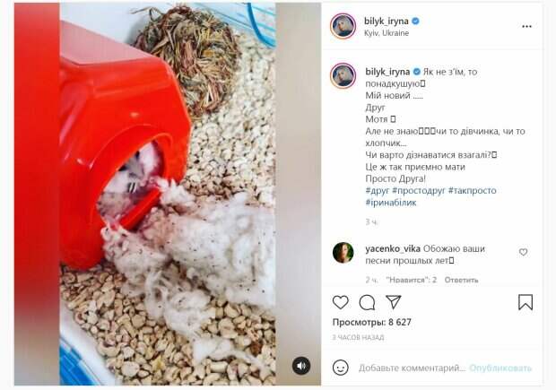 51-летняя украинская певица Ирина Билык показала кадры со своим новым другом Популярная артистка успевает не только заниматься творчеством и воспитывать сына, но и вести соцсети, пишет Politeka.net. В своем посте в Инстаграм певица показала своего нового друга. (Чтобы посмотреть видео, доскролльте до конца страницы) Артистка сняла своего нового любимца - хомячка в клетке, который кушал семечки.
