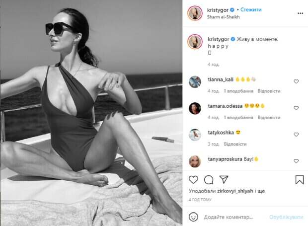 Теперь же, судя по фото в соцсетях, Вова счастлив в браке с новой возлюбленной. Недавно в своем микроблоге Кристина показала яркое фото с отдыха в Египте, на котором запечатлена на яхте. На новом снимке красотка позирует сидя в экстравагантной позе с широко раздвинутыми ногами. Перед камерой она появилась в стильном купальнике интересного фасона, который красиво подчеркнул идеальную фигуру и соблазнительное декольте. Волосы красотки собраны на затылке, а на ее лице модные солнцезащитные очки, она не смотрит в объектив. В подпсии к фотографии Горняк написала: "Живу в моменте". А поклонники тут же принялись активно обсуждать снимок, засыпая девушку комплиментами в комментариях. "Вау!", "Идеальная", "Восхищаюсь!", "Купальник огонь", "Фигура огонь", "Этот купальник просто лав", "И я хочу такой купальник", - пишут восторженны пользователи под фото Кристины. Напомним, Жена Остапчука призналась в своей зависимости, вызвав ажиотаж: "Привет, я Кристина, и я...." Как сообщала Politeka, Остапчуки предались утехам возле бассейна, кадры с жаркого курорта: "Много поцелуев…". Также Politeka писала, Жена Остапчука, рванувшая в Египет без мужа, поразила новыми кадрами: "Как они делают это на жаре? ".