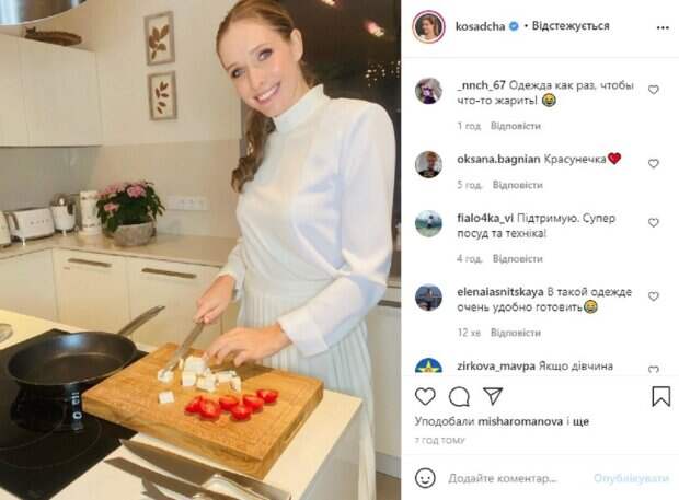 Сама же телеведущая поделилась с поклонниками своим "секретом" рассказав, что готовка для нее отдельный вид творчества. Для меня готовка - это отдельный вид творчества, я люблю приправы и везу их из разных уголков мира, люблю рецепты, ведь готовить одно и то же надоедает, как мне, так и домашним", - призналась Катя. Также телеведущая рассказала о своем пристрастии к посуде. "Отдельная страсть - посуда, от ножей и кастрюль до фарфора и столового серебра. В последнее время мне кажется, что все это я уже люблю больше, чем одежду", - рассказала Осадчая, а заодно поделилась с поклонниками своим открытием, немецким брендом посуды. Поклонники, среди которых на странице у Кати множество женщин согласились со знаменитостью, что приготовление кушать, это сродни написанию картин. "Да-да, готовить - это творчество! Для меня сродни написанию картин) ты смешиваешь специи и вкусы, как краски на полотне)", многие фанаты Кати подметили, что в белоснежном костюме готовить не слишком удобно, и посмеялись на знаменитостью, указав, что все в ее посте выдает рекламу: "Я тоже так, надену роскошный костюм и начинаю готовить", "Якби ще та посуда була доступна простим людям!!!!", "Ви що завжди одне й те саме блюдо готуєте «сир і помідори»? і тільки одяг змінюєте)))", "Катя, а в рамочке на стене, чье творчество?", "Одежда как раз, чтобы что-то жарить!