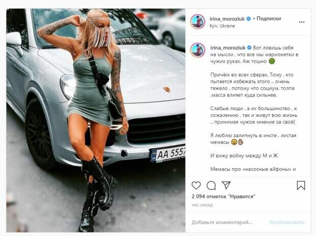 Образ звезда дополнила странной восточной маской на лице, берцами и сумочкой через плечо. Об этом пишет Politeka.net со ссылкой на страничку знаменитости. "Вот ловишь себя на мысли , что все мы марионетки в чужих руках. Аж тошно. Причём во всех сферах. Тому , кто пытается избежать этого .. очень тяжело , потому что социум, толпа ,масса влияет куда сильнее. Слабые люди , а их большинство , к сожалению , так и живут всю жизнь .. принимая чужое мнение за своё( Я люблю залипнуть в инсте , листая мемасы", - написала Ирина. Фанаты поставили более двух тысяч лайков и написали комментарии: "так я не понял , ты тогда купила киндер или нет", "Заглушки в бампер поставь", "Аж торчат", "Хороша, чертовка". Мы сообщали, что бывшая жена украинского игрока Николая Морозюка, экс-футболиста "Динамо", показала занятие в спортзале. На кадрах Ирина лежала на коврике в топе и лосинах. На ногах можно увидеть резинку и кроссовки. Красотка положила камеру боком, чтобы показать упражнение для ног. Напомним, бывшая жена экс-динамовца Морозюка задрала боди, показав самые пикантные места А еще Politeka писала, что бывшая жена экс-динамовца Морозюка ослепила подкачанной фигуркой в коротком топе, горячие кадры Также Politeka сообщала, что бывшая жена Морозюка задрала юбку, раскрыв секрет идеальной фигуры