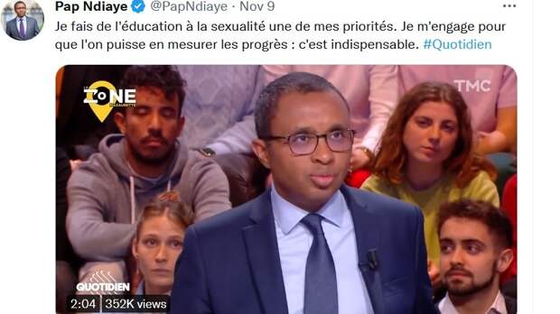 Возмутивший общественность пост в Twitter министра образования Франции про уроки секспросвета посмотрели 350 тыс пользователей социальной сети на 14 ноября. Волну негодования интернет-пользователей Франции вызвал пост в Twitter министра образования страны Пап Ндиайе от прошлой среды, где он назвал уроки секспросвета приоритетом школы.