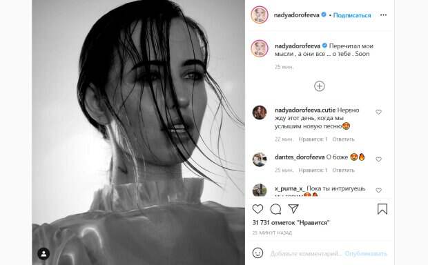 На снимке она позирует крупным планом, наглядно демонстрируя зрителям свою красоту. На фото видна лишь горловина блузы певицы, однако судя по ней, Надя позирует в непривычно нежном и романтичном наряде. Ее волосы выглядят влажными и беспорядочно разлетаются по лицу певицы. Дополняет образ Дорофеевой чувственный макияж, благодаря которому ее глаза выглядят особенно выразительными. Стоит отметить, что обычно певица предпочитает более дерзкие образы, однако и такой стиль ей тоже безумно идет. «Перечитал мои мысли, а они все...о тебе. Soon», - подписала снимок Надя. Можно предположить, что певица готовится к выпуску новой песни. По крайней мере, именно на это надеются ее поклонники в комментариях. «Ждём новый хит, который точно всем зайдет», «Строчка из новой песни?», «Нервно жду этот день, когда мы услышим новую песню», «О боже», «Пока ты интригуешь мы горим», «Вааааау, нереальная Надюх», «На Майли Сайрус похожа», «Наша принцесса», «Совсем на себя не похожа, но очень красивая», - пишут люди. Напомним, Олег Винник и Дорофеева сцепились на "Голосі країни", Кароль тоже в деле: "Я буду бороться!". Как сообщала Politeka, Дорофеева отхватила себе талантливых красавчиков, Дантес будет ревновать: "Мои пацаны". Также Politeka писала, что худышка Дорофеева сняла на видео свои домашние развлечения, поразив фигурой: "Поза неплохая".