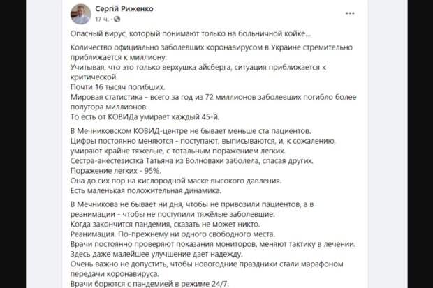 Всего за год из 72 млн заболевших погибло более 1,5 млн. "В Мечниковском ковид-центре не бывает меньше ста пациентов. Цифры постоянно меняются – поступают, выписываются, и, к сожалению, умирают крайне тяжелые, с тотальным поражением легких", – написал он. Он также добавил, что в Мечникова не бывает ни дня, чтобы не привозили пациентов, а в реанимации - чтобы не поступили тяжёлые заболевшие, у врачей нет и дня передышки. "Когда закончится пандемия, сказать не может никто. Реанимация. По-прежнему ни одного свободного места. Врачи постоянно проверяют показания мониторов, меняют тактику в лечении. Здесь даже малейшее улучшение дает надежду. Очень важно не допустить, чтобы новогодние праздники стали марафоном передачи коронавируса", – отметил медик. Напомним, что по состоянию на утро вторника, 15 декабря, в Украине официально подтверждены 909 082 случаев коронавирусной инфекции. Из них 8 416 – обнаружено за прошедшие сутки. От COVID-19 в стране умерли уже 15 480 человек (+233 за сутки), а 522 868 пациентов (+16 150 за сутки) полностью победили болезнь. Напомним, китайский вирус погубил семью украинского депутата, двое детей остались сиротами. Как сообщала Politeka, ситуация в украинских больницах ухудшается с каждым днем, врачи бессильны. Также Politeka писала, что зараженных украинцев стало меньше: врач назвала причину и раскрыла, что будет дальше.