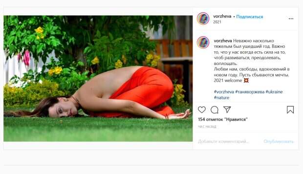 Так, знаменитость подчеркнула, что сейчас главное – найти в себе силы преодолеть последствия предыдущего года. «Неважно насколько тяжелым был ушедший год. Важно то, что у нас всегда есть сила на то, чтоб развиваться, преодолевать, воплощать. Любви нам, свободы, вдохновений в новом году. Пусть сбываются мечты. 2021 welcome», - написала Воржева. Она также поделилась архивной фотографией, сделанной в жаркое время года. На снимке ведущая припала к земле в жизнерадостном красном платье с открытой спиной. Яркая зелень вокруг придает снимку сочности и атмосферности. Ведущая выбрала для фото необычную позу: она села на колени и буквально «сложилась» пополам, положив голову на землю и вытянув руки вдоль тела. Такая поза выглядит весьма непривычно и оригинально. Отметим, что в одном из интервью Воржева комментировала тему своего сходства с Джоли. «Мы с ней похожи не только внешне, но и по внутренним потенциалам. И мне было не очень приятно, когда она начала рассказывать о своих операциях. Афишировать это – лишнее», - заявляла ведущая. Напомним, украинская Анджелина Джоли сверкнула холеным декольте на теннисном корте: "Желаю всем...". Как сообщала Politeka, украинская Анджелина Джоли в белоснежном боди выставила напоказ безупречное тело: «Чищу перышки». Также Politeka писала, что украинская Анджелина Джоли покорила аппетитными «холмами», приспустив наряд: «Уверенно двигаюсь…».