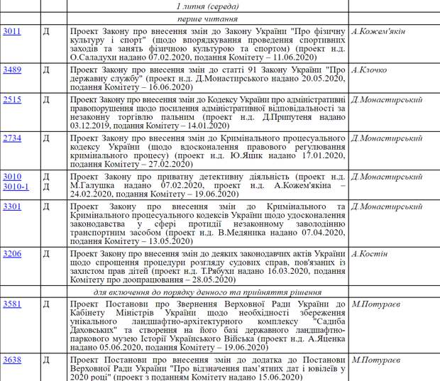 1 июля Верховная Рада соберется на пленарное заседание, на котором, в частности рассмотрит в первом чтении законы о физической культуре и спорте и государственной службе. Об этом говорится в повестке дня парламента. Также народные депутаты рассмотрят проекты законов об усилении административной ответственности за незаконную торговлю горючим, о частной детективной деятельности и о совершенствовании законодательства в сфере противодействия незаконному завладению транспортным средством.