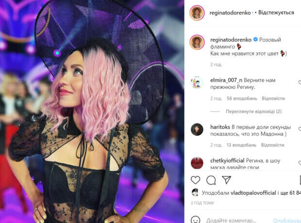 Девушке надели розовый парик и огромную черную шляпку. Образ Тодоренко получился весьма неожиданным и необычным. «Розовый фламинго. Как мне нравится этот цвет», - подписала фото Регина. В комментариях поклонники стали спорить. Одним образ понравился, а другие раскритиковали Тодоренко за поведение на шоу и странный наряд. Кроме этого, многие фаны отметили, что Регина на этом фото сильно похожа на американскую певицу Мадонну. «Верните нам прежнюю Регину», «В первые доли секунды показалось, что это Мадонна», «Лиф упал вниз слегка», «На Мадонну похожа», «Я подумала Мадонна на фото))», «Очень красиво! Образ очень понравился!», «Грудь чуть ли не на животе», - пишут пользователи сети. Ранее мы писали, что Регина Тодоренко поделилась соблазнительным фото в постели. Напомним, что раздетая Тодоренко из "Орла и решки" показала свою "проблему", засмущав видом в спальне: "Это ужас". Как сообщала Politeka, Тодоренко из «Орла и решки» наделала шуму резкой сменой имиджа: «Не ожидала от себя…». Также Politeka писала, что бесстыжая Тодоренко в невидимых трусах показала, как развлекается в отпуске: «Экстремальная мамаша».