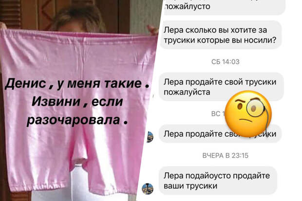 Ведущая Лера Кудрявцева в своих социальных сетях поделилась скриншотом из раздела сообщений, где неизвестный мужчина настойчиво просит продать ему нижнее белье. В ответ знаменитость отправила ему фотографию из интернета. Фото: социальные сети Кудрявцевой «У меня такие. Извини, если разочаровала», — с иронией написала Кудрявцева.