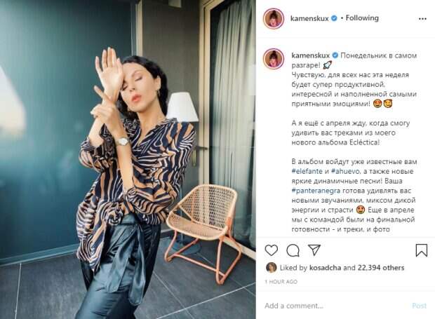 Для такого фото Настя Каменских нарядилась в блузку тигровой расцветки, которую задрала с одной стороны, а также шелковые штаны с поясом. Волосы звезда собрала в пышную прическу сзади. "Понедельник в самом разгаре!