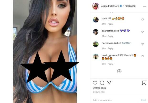 Эби Рэтчфорд сделала селфи в комнате, продемонстрировав свою грудь крупным планом. Из одежды на ней можно заметить только бюстгальтер в синюю и белую полоску, который выгодно подчеркнул главные достоинства владелицы. Модель приоткрыла губки, сделав кадр еще более пикантным. Дополнительного шарма придали глаза девушки, один из которых "спрятался" за прядью волос. Пользователи социальной сети оценили потрясающий вид на фигуру красотки и засыпали ее приятными отзывами в комментариях: "Ты потрясающая девушка"; "Мне тебя не хватает, дорогая"; "По-настоящему горяча"; "Ты красивая, моя дорогая, я так сильно тебя люблю, ты потрясающая ❤️❤️"; "Аж челюсть отвалилась"; "Ты выглядишь совершенно потрясающе