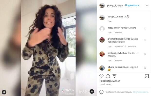 Настя предстала без косметики и прически, в несколько растрепанном виде. Особенным бонусом стало то, что звезда "забыла" о нижнем белье: активно двигасясь под музыку, это становится еще заметнее. На этом странности не закончились. Каменских смутила непонятными телодвижениями, размахивая руками и подыгрывая бедрами. Публика с жаром обсуждает увиденное, и у нее в TikTok, и на фан-страничке. Многим не понравился танец Насти, мол, то, что хорошо для подростков, ей не идет. "Обнять и плакать"; "Когда Вы уже повзрослеете???"; "Откуда эти движения?