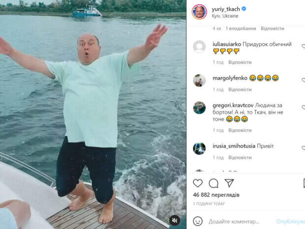 При этом, артист смог обыграть все таким образом, чтобы насмешить поклонников. Многие фанаты так и не поняли, это была шутка, или все действительно чуть не закончилось несчастным случаем. «Чуть не кинул якорь», - подписал видео артист. В комментариях Ткачу оставили массу приятных слов и шуток. Не обошлось и без критики. «Матерь Божья», «Вот это выкрутасы!», «Молодец, что удержался! А то бы Днепр из берегов бы вышел», «Актерская игра на уровне», «Та ладно. Якорь без штанов кидают», «Ага, вышел бы Днепр из берегов. Тогда было бы не до смеха», «Человек за бортом! А нет, то Ткач, он не тонет», - пишут пользователи сети. Ранее мы писали, что покрасневший Юрий Ткач заинтриговал необычным фото с зонтиком. Актер позировал в синем пиджаке, а его цвет лица был необычно красным. «Сгорел на работе», - подписал фото актер. Напомним, что Ткач из "Квартал 95" поразил кадрами на борту самолета: "Пункт назначения". Как сообщала Politeka, Юрий Ткач, Сопонару и Саливанчук из "Квартал 95" устроили "покатушки" в роскошном кабриолете: "Навстречу уик-энду". Также Politeka писала, что Ткач из "Квартал 95" в обнимку с двумя красавицами вызвал зависть: "Юрчик, это твои?".